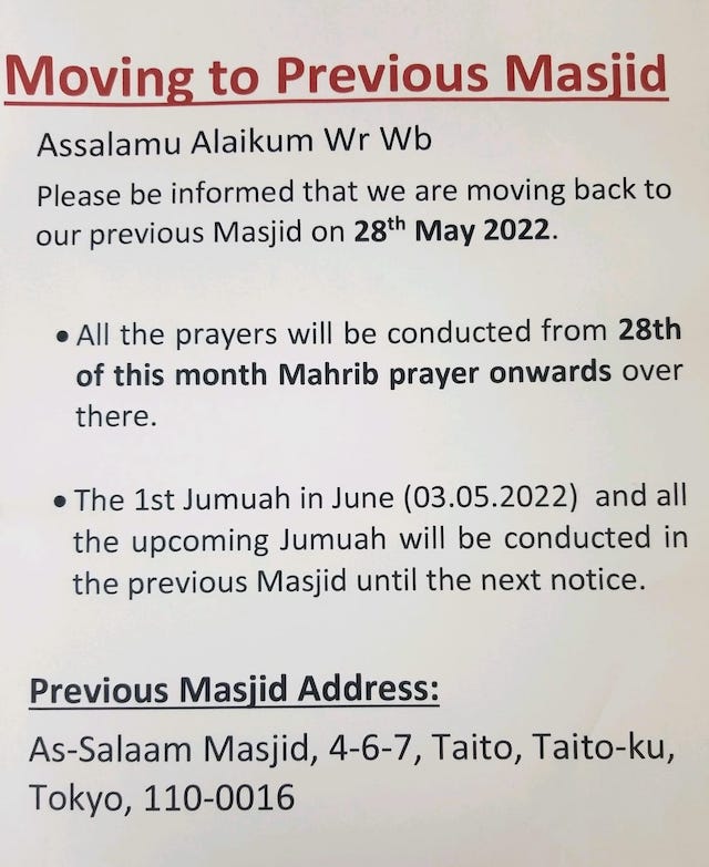 5月28日(土)に元のマスジドへ引越致します。 5月28日(土)のマグリブから、礼拝は元のマスジドで行います。 6月3日以降の金曜日礼拝も元のマスジドで行います。 住所は下記の通りです。 東京都台東区台東4−6−7